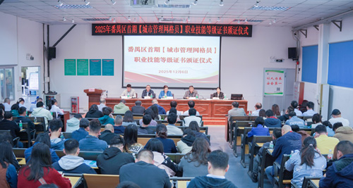 群12月6日上午,番禺区在区网格员培训基地(区高技能人才公共实训鉴定基地)举行首期城市管理网格员职业技能等级证书颁发仪式。